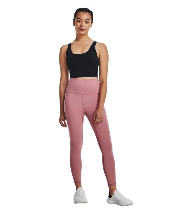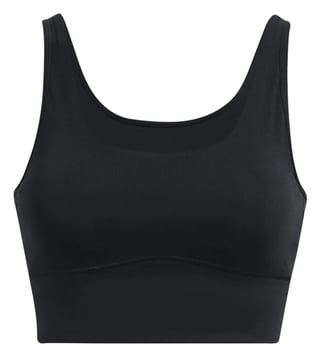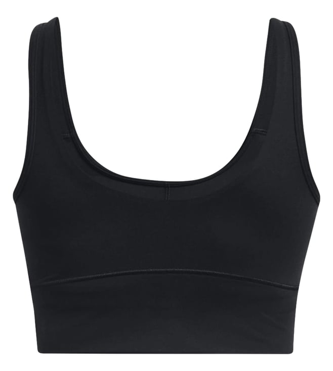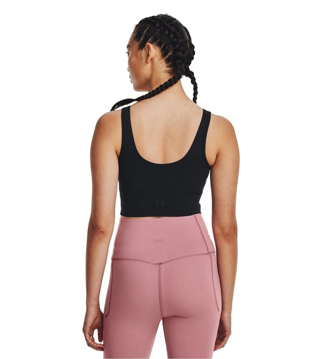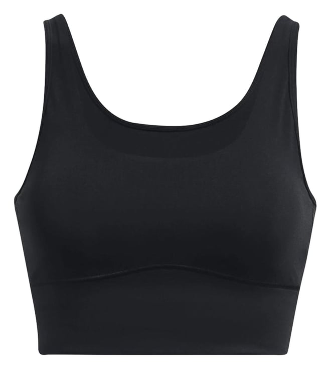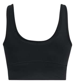 Leave behind a trail by wearing this black slim fit sleeveless sports bra from UNDER ARMOUR. Tailored to sartorial perfection from premium quality fabric, it assures a soft and soothing touch against the skin. The round neck adds to its appeal.