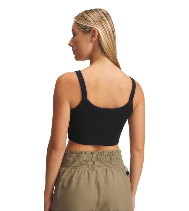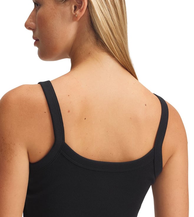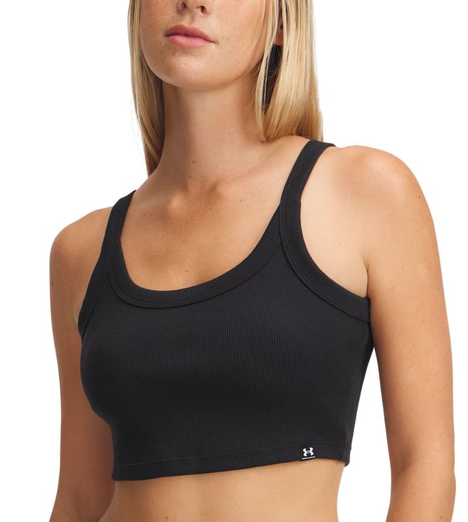 Stand out in the crowd by donning this black slim fit sleeveless sports bra from UNDER ARMOUR. Tailored to sartorial perfection from premium quality fabric, it assures a soft and soothing touch against the skin. The round neck adds to its appeal.