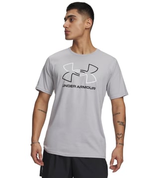 The UNDER ARMOUR Gray Regular Fit Graphic Short Sleeves GL FOUNDATION Update T-Shirt is a versatile staple for any wardrobe. Crafted from a breathable, high-performance fabric, this tee offers unparalleled comfort and durability. Its sleek gray hue is complemented by a bold, modern graphic pattern that adds a touch of dynamic style. Designed for all genders, the regular fit ensures a flattering silhouette, while the short sleeves provide ease of movement, making it perfect for both casual outings and intense workouts.