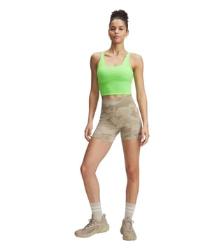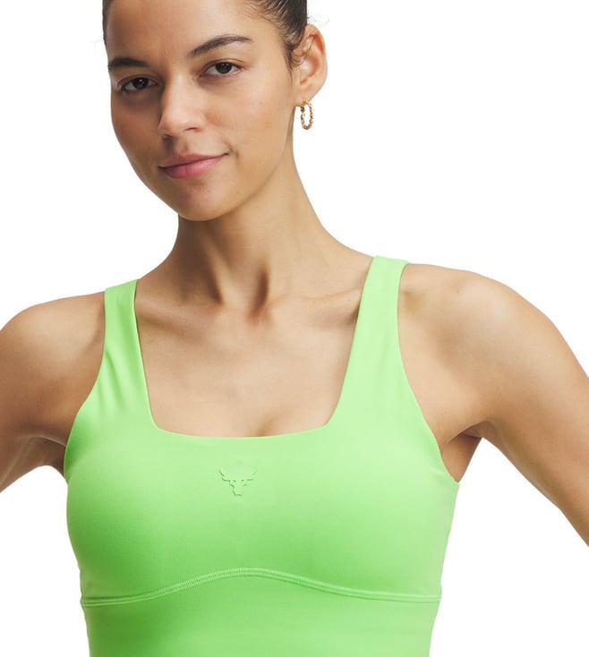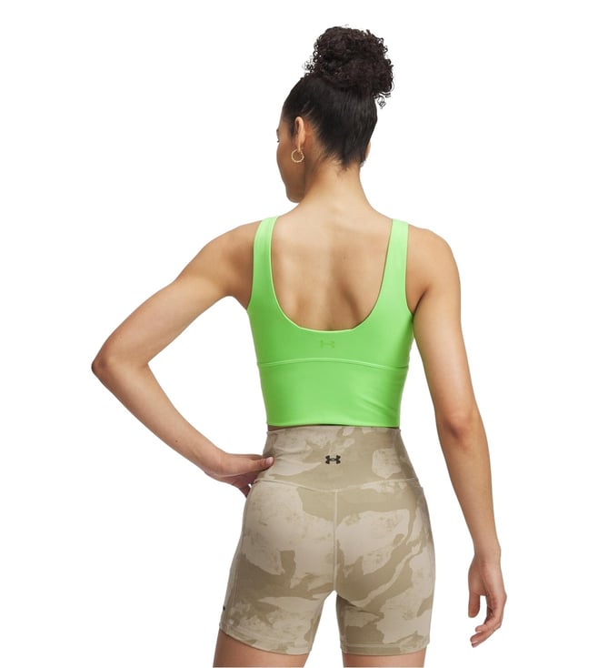 Get hold of a refreshing look by donning this green slim fit sleeveless sports bra from UNDER ARMOUR. Tailored to sartorial perfection from premium quality fabric, it assures a soft and soothing touch against the skin. The square neck magnifies its overall appeal.