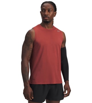 Unleash your inner athlete with the UNDER ARMOUR Red Regular Fit Solid Sleeveless Vent Vest. Crafted for ultimate performance, this vest boasts a vibrant red hue that commands attention. Its sleek, solid pattern exudes a modern edge, while the breathable fabric ensures comfort and flexibility. Designed for all genders, this vest is perfect for intense workouts or casual outings. The innovative venting system keeps you cool and dry, making it an essential addition to your activewear collection.