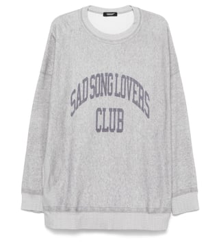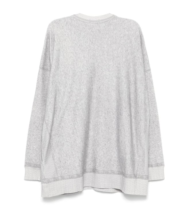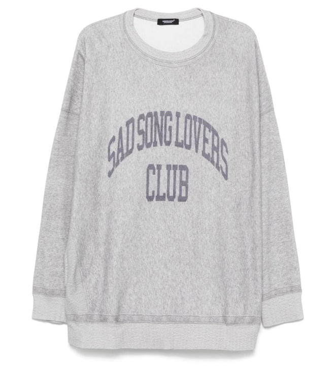 Elevate your style with the Undercover Grey Typography Oversized Fit Sweatshirt. Grey cotton jersey texture slogan print to the front melange effect ribbed trim crew neck drop shoulder long sleeves two side inset pockets french terry lining straight hem.