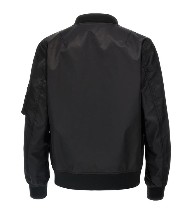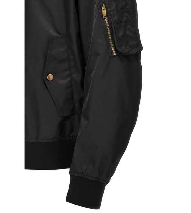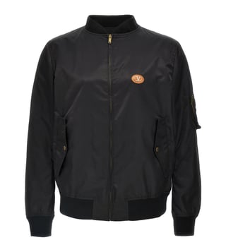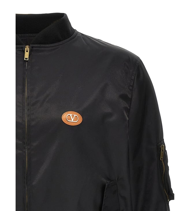 Elevate your style with the Valentino Garavani Black Bomber Jacket. Bomber jacket in technical fabric, leather and metal logo patch on the front, zip closure, pockets, long sleeves with knitted cuffs. True to size fit. Products purchased from Darveys are supported exclusively by the warranty/exchange policies of Darveys and its partner boutiques. Brand owners and their channel partners are not responsible for exchange/warranty services for items purchased through Darveys.