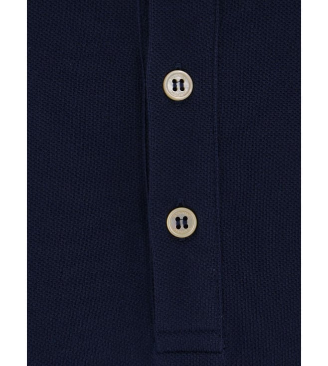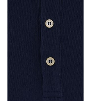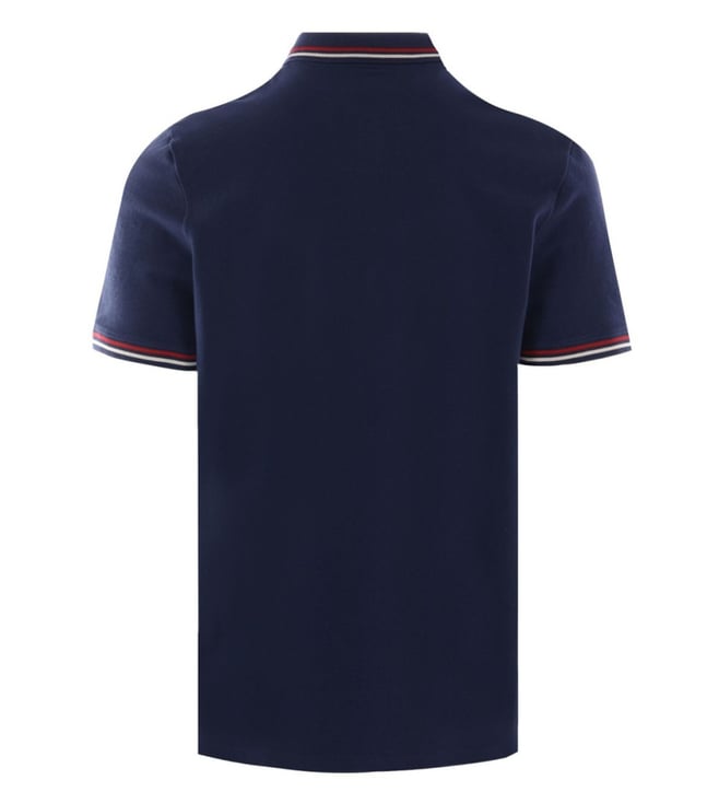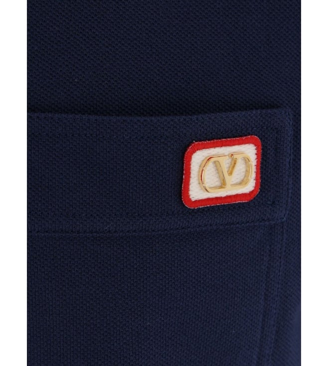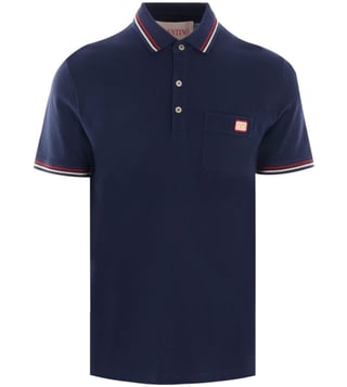 Elevate your style with the Valentino Garavani Navy Blue polo t-shirt. Short front button fastening chest patch pocket striped edge short sleeves.
