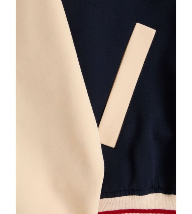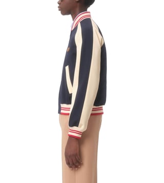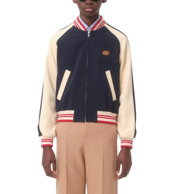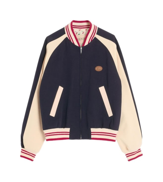 Elevate your style with the Valentino Garavani Navy Bomber Jacket. Navy blue vlogo patch le chat de la maison patch front zip fastening long sleeves stripe detailing slip pockets to the sides ribbed cuffs and hem. Products purchased from Darveys are supported exclusively by the warranty/exchange policies of Darveys and its partner boutiques. Brand owners and their channel partners are not responsible for exchange/warranty services for items purchased through Darveys.