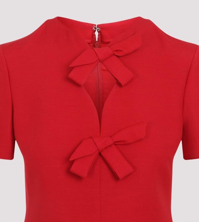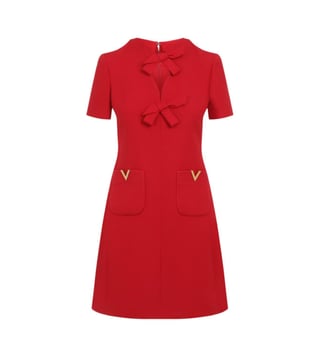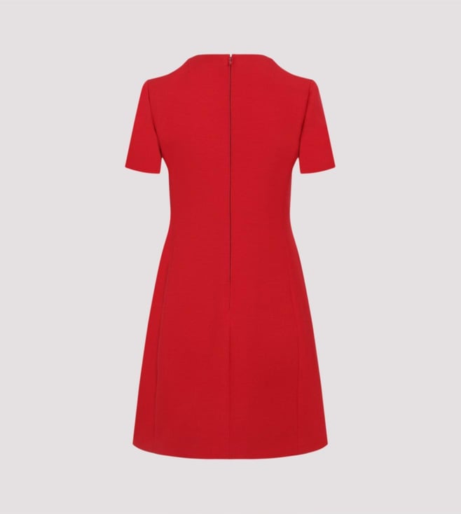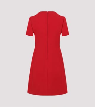 Embrace elegance with this striking red dress, a masterpiece of solid sophistication. Crafted from a luxurious blend of 65% virgin wool and 35% silk, it offers a sumptuous feel against the skin. The short sleeves add a touch of modernity, while the tie-up neck exudes timeless charm, allowing for a customizable fit. Designed for the discerning woman, this dress is a statement of bold grace, perfect for any occasion where you wish to leave a lasting impression.