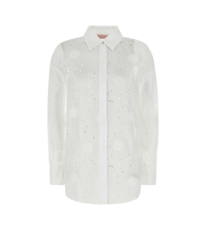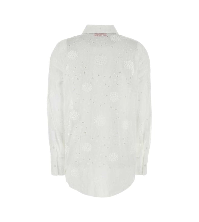 Elevate your wardrobe with this chic white casual shirt, featuring a sophisticated perforated pattern that adds a touch of elegance to any ensemble. Crafted from 100% cotton, it promises comfort and breathability, making it perfect for any season. The long sleeves and classic shirt collar offer a timeless silhouette, while the sleek closure ensures a polished finish. Designed for the modern woman, this versatile piece effortlessly transitions from day to night, embodying both style and functionality.