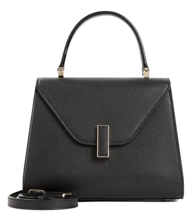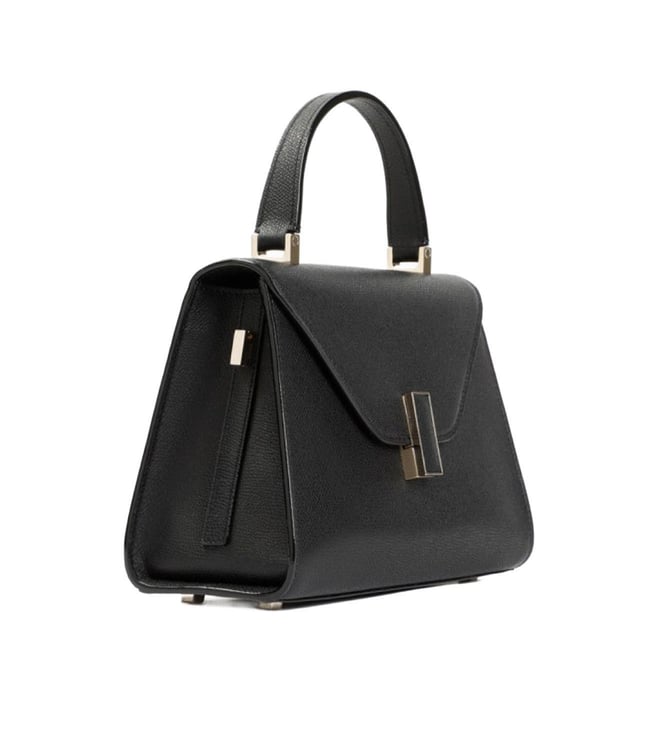 Valextra black iside top handle mini bag. Black leather, golden-tone clasp closure with a leather insert. Tonal detachable and adjustable strap, signature black lacquered costa edges painted by hand. Handle on top, golden-tone hardware. Fully lined.