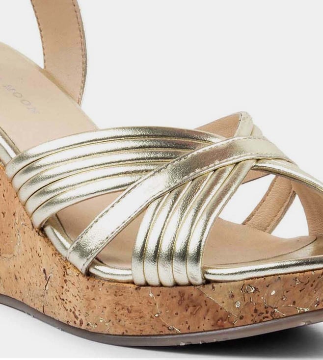Curate a stylish look by wearing this pair of wedges from Vanilla Moon. The manmade sole offers an exceptional grip and balance, while the leather upper completes the classy look of this pair. Featuring a gold-hued ribbed upper and an ankle strap for support, the pair is sure to accentuate your look. This pair is perfect for the wedding dance. Disclaimer: Product colour may slightly vary due to photographic lighting sources. Country Of Origin - India.