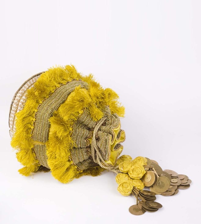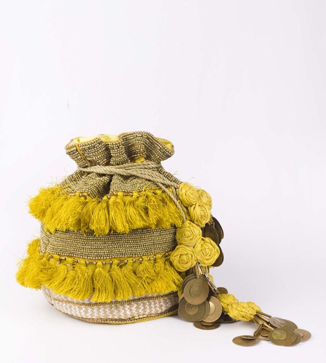 Chic and spacious, this potli from Vareli Bafna will help you to keep your everyday essentials handy while you are on the move. Assured to hold your belongings safe, this high-quality khadi silk piece is all you need to be in fashion. Featuring a wrist strap, this also has an embellished pattern, sequin work chain and jute work with tassels that makes it look utterly chic. Country of Origin - India. Disclaimer: Product colour may slightly vary due to photographic lighting sources.