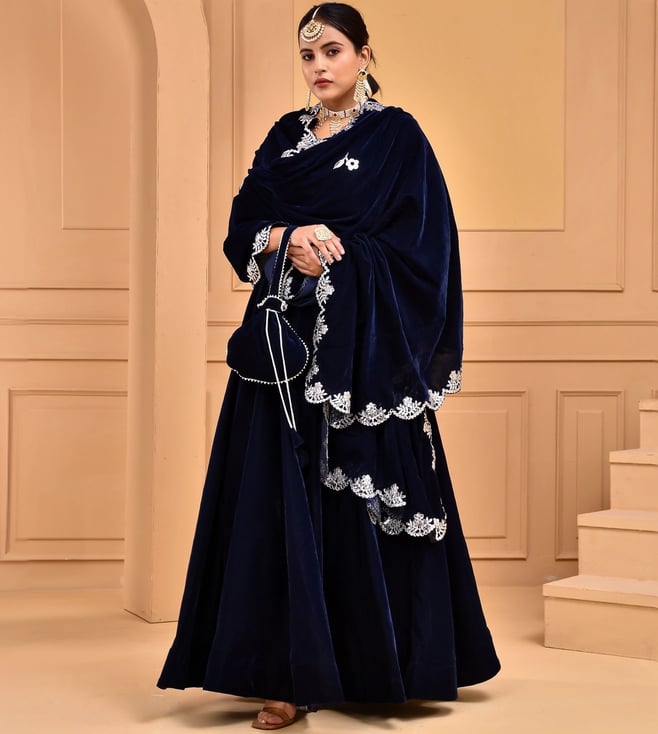 Navy Blue Velvet Stitched Lehenga and Blouse With Dupatta