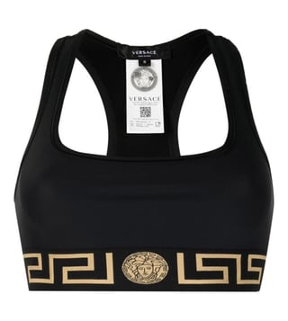 Versace black greca racerback sports bra crafted in a stretch fabric with signature greca pattern and medusa motif. Designed with a scoop neck and racerback style it offers a supportive and comfortable fit. Non wired and non padded construction makes it perfect for everyday wear or light workouts. Products purchased from Darveys are supported exclusively by the warranty/exchange policies of Darveys and its partner boutiques. Brand owners and their channel partners are not responsible for exchange/warranty services for items purchased through Darveys.