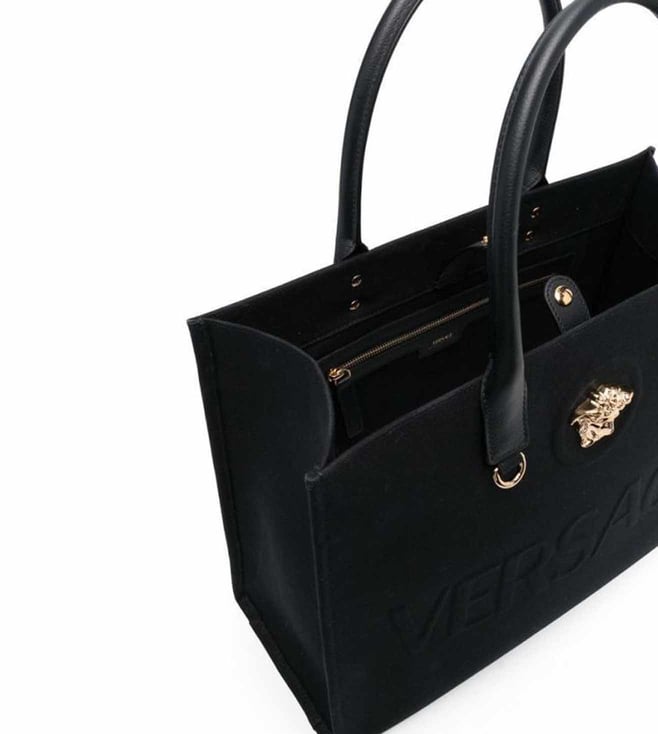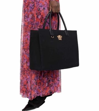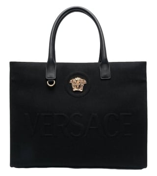 La medusa canvas tote bag from versace featuring black, canvas, medusa plaque detail, embossed logo to the front, two rolled top handles, press-stud fastening, main compartment and internal zip-fastening pocket. Products purchased from Darveys are supported exclusively by the warranty/exchange policies of Darveys and its partner boutiques. Brand owners and their channel partners are not responsible for exchange/warranty services for items purchased through Darveys.