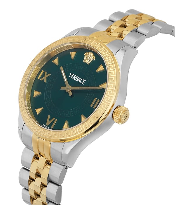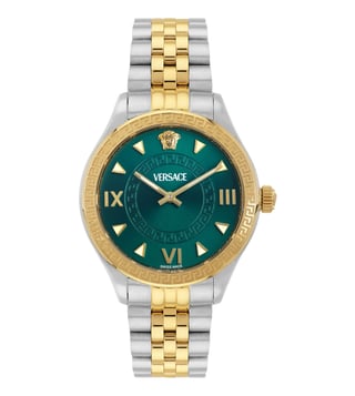 The Versace Hellenyium Lady Rest 35 mm womens analog watch features a captivating green dial set within an elegantly compact case. This timepiece exemplifies refined craftsmanship and offers clear visibility alongside comfortable wear. Designed for women who appreciate timeless sophistication, it is a versatile accessory that enhances both casual and formal looks with subtle luxury.