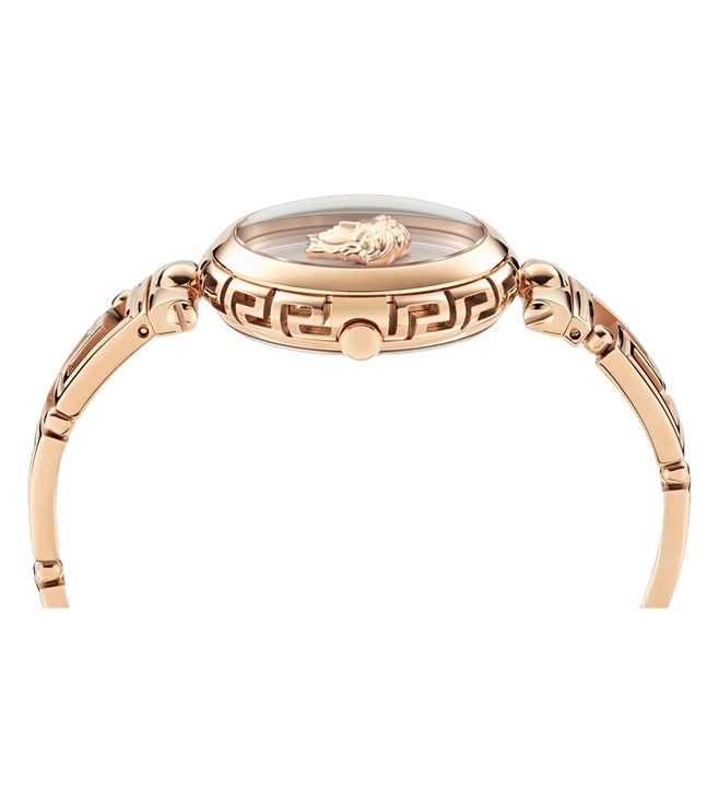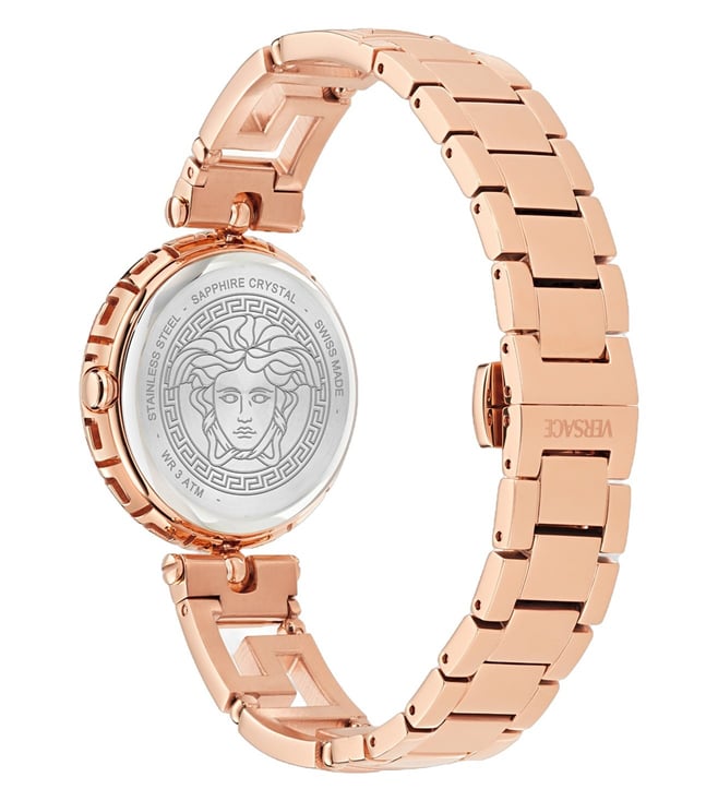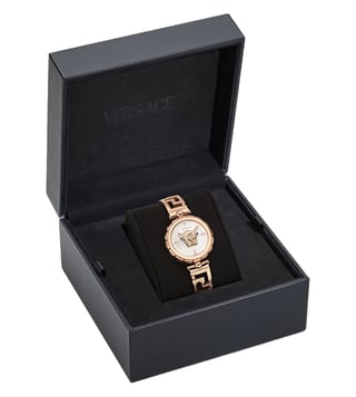 In the enchanting realm of timepieces, behold the "Medusa Jewel" watch, a celebration of femininity and elegance. Its captivating case pays homage to the allure of the three-dimensional Medusa, gracefully floating upon the dial. Adorned with the iconic La Greca pattern encircling the case, this watch seamlessly integrates into the FW24 KEY collection, fortifying the brands DNA with each glance. Its jewelry bracelet, intricately crafted to resemble a translucent Greek motif, adds a touch of ethereal beauty to this masterpiece, ensuring it stands as a timeless symbol of Versaces unique charm