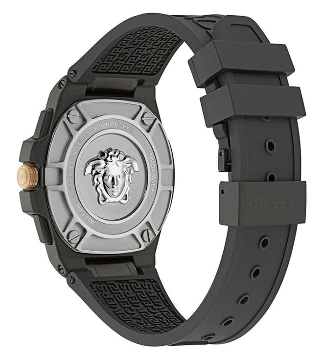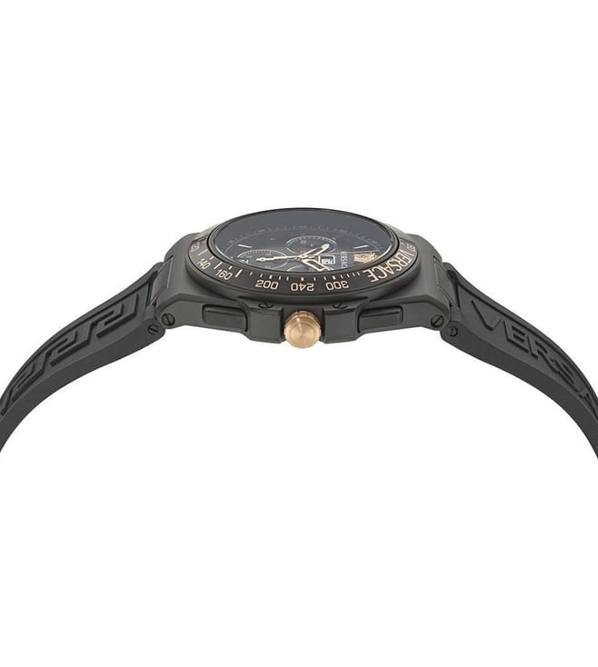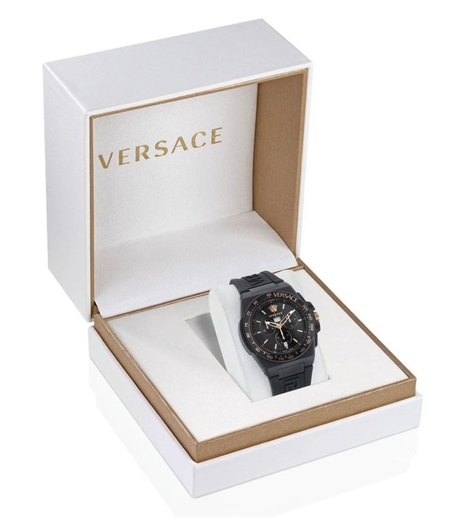 Look charming donning this men's analog watch from the Greca Extreme Chrono collection by Versace. The rubber strap exudes a black hue that accentuates the look of the watch. Encased in a 44.84 mm case, the black round dial is protected by a sapphire crystal with anti-reflective coating. It features plain three hands. Besides, it is completed with a buckle clasp to ensure a secure fit on the wrist.