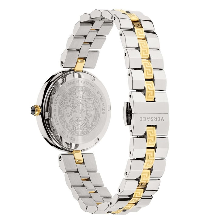 This Swiss-made Ronda 762/3 quartz with 2 hands movement boasts a Barocco V on a 34 mm dial with a see-through design. Virtus Infinity, combines the use of the Greek key creating a distinctive trait that brings together two icons and enhances them in all their beauty. The watch is wrapped in a ring of the signature Greca pattern, the iconic features of the watch giving an instantly recognizable Versace touch while the Virtus Versace adorns and decorates the dial.