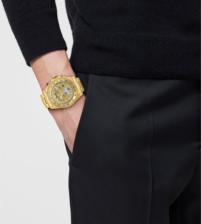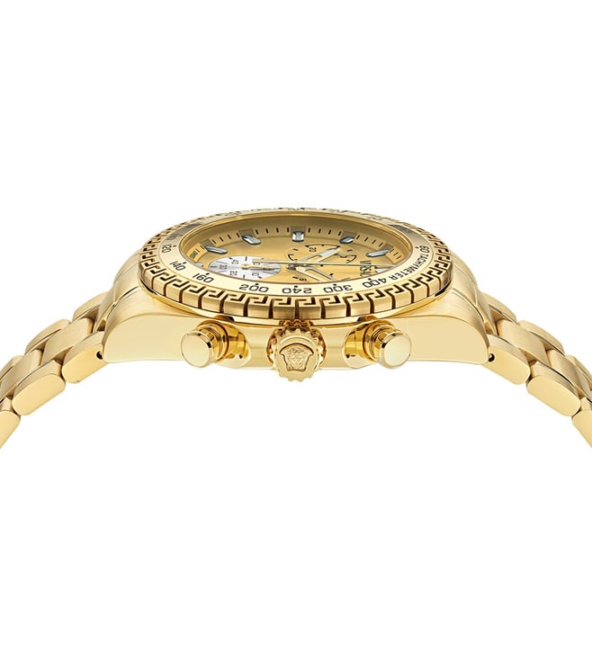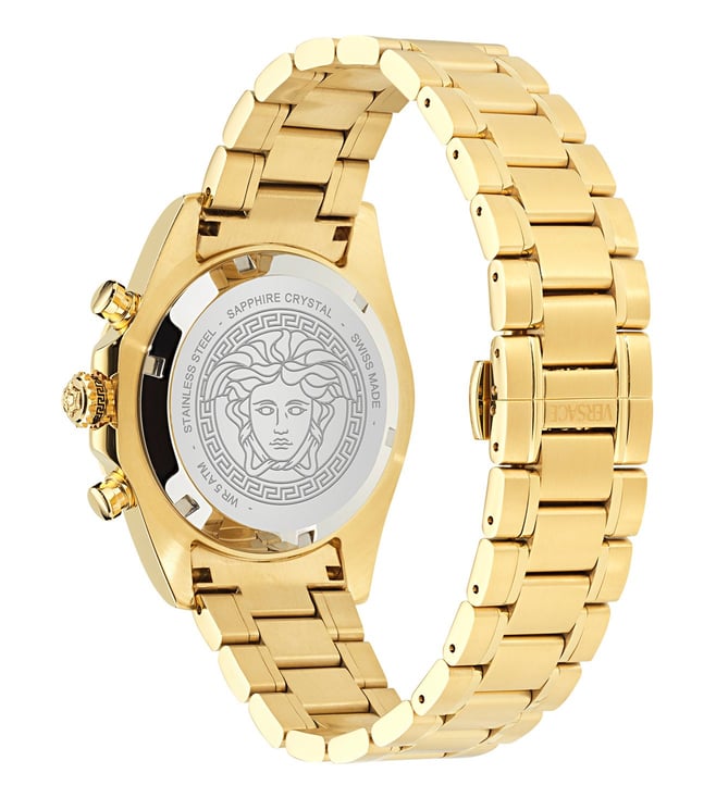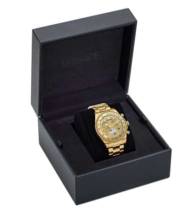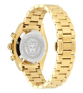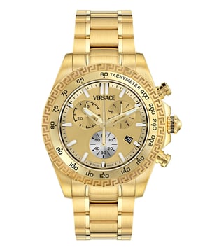 The Versace Chrono 44 mm features a luxurious gold dial with precise chronograph functionality, designed for men who appreciate a blend of classic elegance and advanced technical performance. Its substantial 44 mm case and refined craftsmanship deliver a sophisticated timepiece that elevates both professional and formal attire.