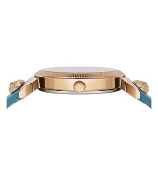 Get hold of this stylish women's analog watch from Versus By Versace and make a distinct style statement. The champagne round dial is housed in a 14 mm case. It exhibits plain three hands and a crown for time adjustment. The genuine leather strap showcases a green hue that uplifts the look of the watch.