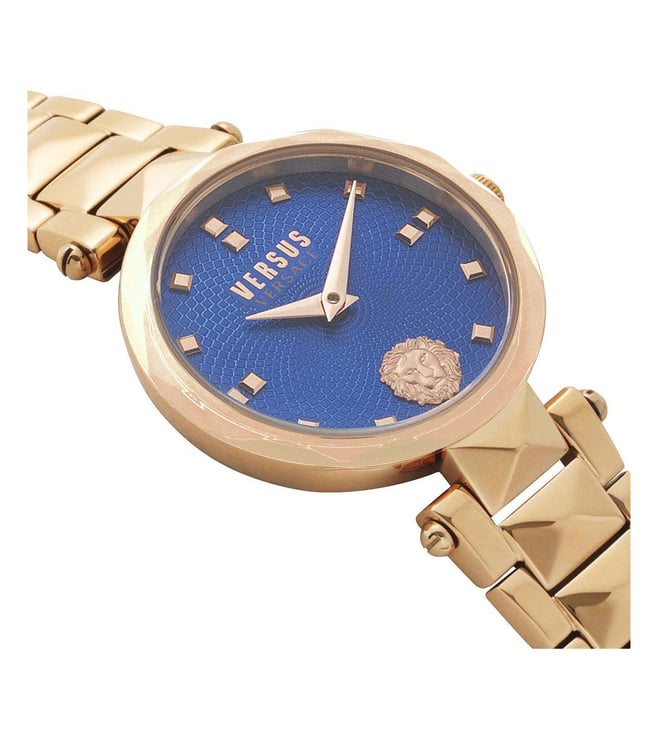 Add a classy touch to your attire by wearing this women's analog watch from Versus By Versace. Encased in a 16 mm case, the blue round dial features plain two hands and a crown for time adjustment. The stainless steel strap flaunts a gold-tone hue that accentuates the look of the watch.
