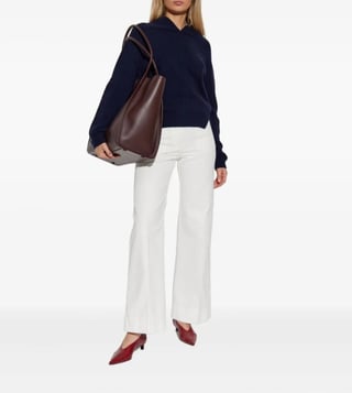 Indulge in the timeless elegance of the Victoria Beckham Navy Blue Wool Blend V-Neck Jumper. Crafted from luxurious 100% wool, this exquisite piece envelops you in warmth and sophistication. The deep navy hue exudes classic charm, while the subtle pattern adds a touch of modern flair. Designed for the discerning woman, its sleek silhouette and refined closure ensure a perfect fit. Elevate your wardrobe with this versatile jumper, a testament to Victoria Beckham's impeccable style and craftsmanship.