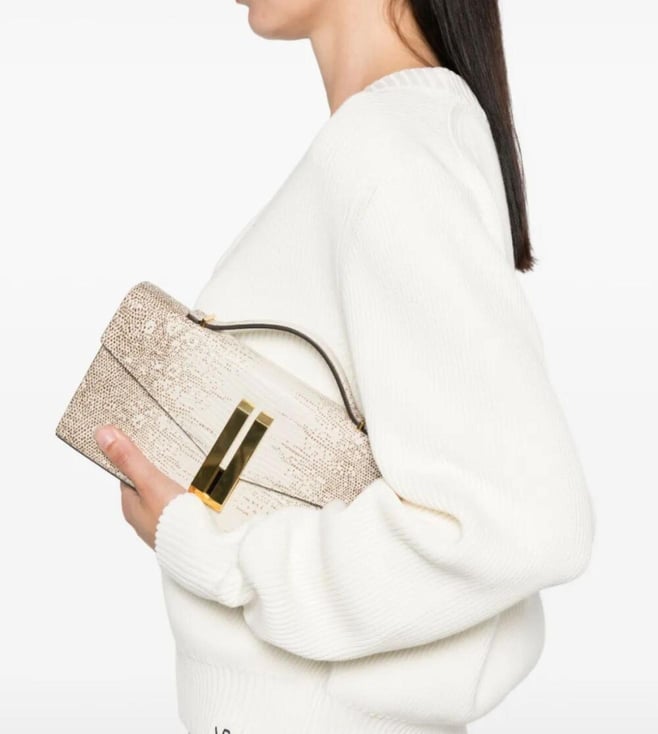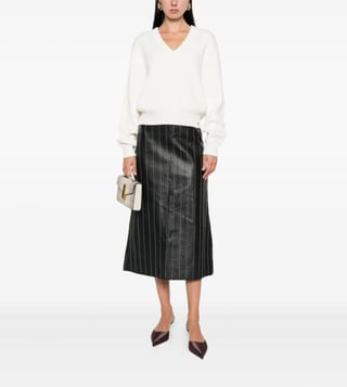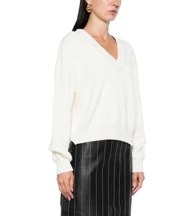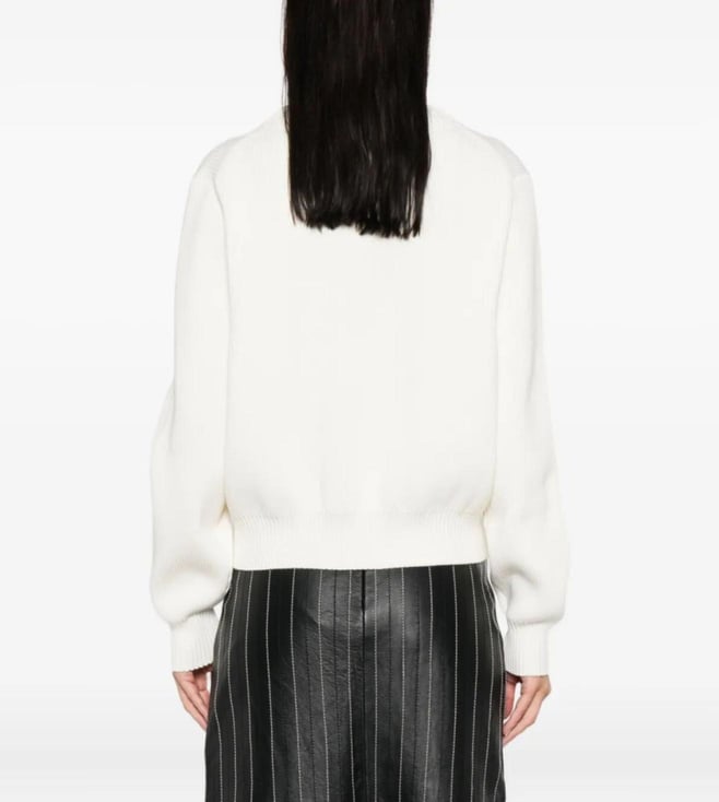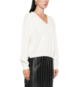 Elevate your wardrobe with the Victoria Beckham White V-Neck Sweater, a masterpiece of minimalist elegance. Crafted from 100% cotton, this sweater offers a luxurious touch and breathable comfort. Its pristine white hue complements the subtle, intricate pattern, adding a layer of sophistication. The V-neck design enhances femininity, while the seamless closure ensures a sleek silhouette. Perfect for the modern woman, this sweater effortlessly transitions from casual to chic, embodying timeless style.