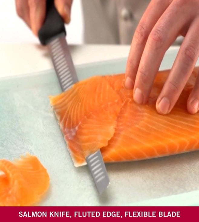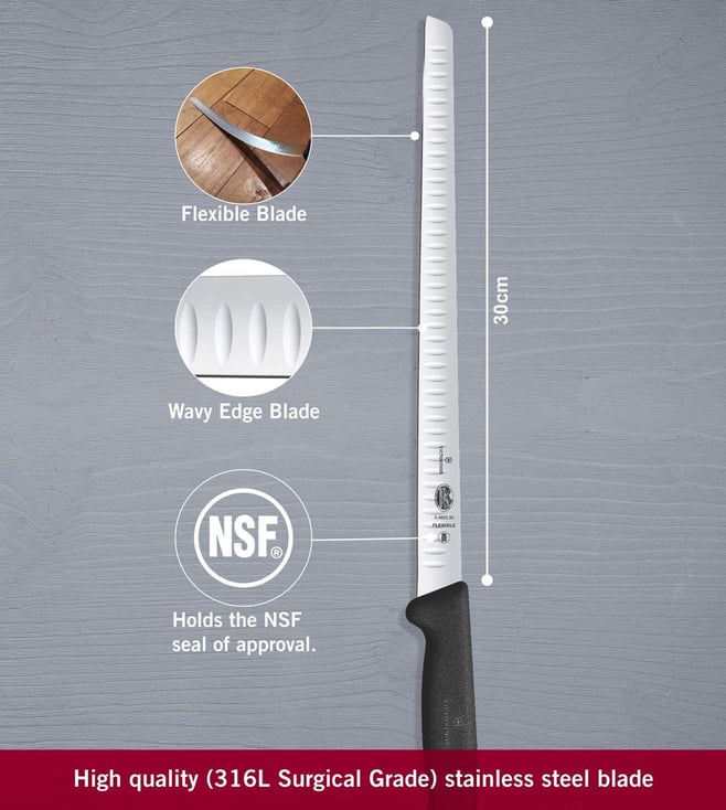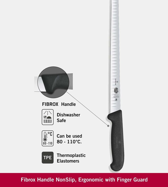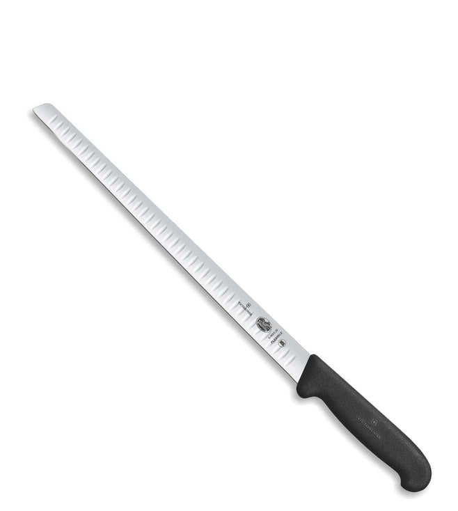 This Victorinox knife is a highly durable tool which can smoothly cut through roast, barbeque, ribs and other hard meat. An excellent tool for deboning, filleting and trimming your favourite meat efficiently, it also helps in preparing large fruits and vegetables with effortless ease. The blade of this slicing knife stays sharper for longer and provides the perfect weight and balance. With its fluted edge, the blade also eliminates friction and prevents food from sticking to it. The ergonomic handle made from is slip-resistant and provides a sturdy grip.