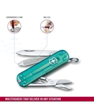 The Classic SD Swiss army knife is a multitasker that can deliver in any situation. At its most basic, it is a blade, a precision cutting tool. At its most evolved, it is pioneered space travel and restarted engines. Around the house, screw in a bolt, cut through a parcel, role-play an electrician or a plumber. As a travel companion, you can pocket it and go on that trip you crave. Wilderness wanderers and resourceful ramblers alike will find their ideal partner for outdoor exploits. The knives are created using environment-friendly light materials.