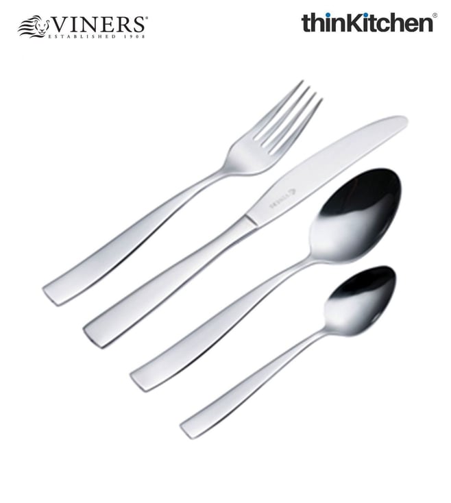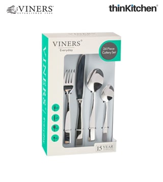 Viners Everyday Purity 24pc Cutlery Set Stylish and balanced with smooth flared handles. Includes 6 knives, forks, teaspoons & dessert spoons. Made from durable 18/0 stainless steel, rust-resistant, dishwasher safe, 15-year guarantee.