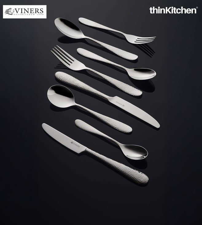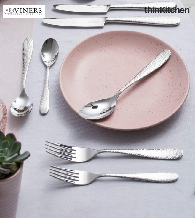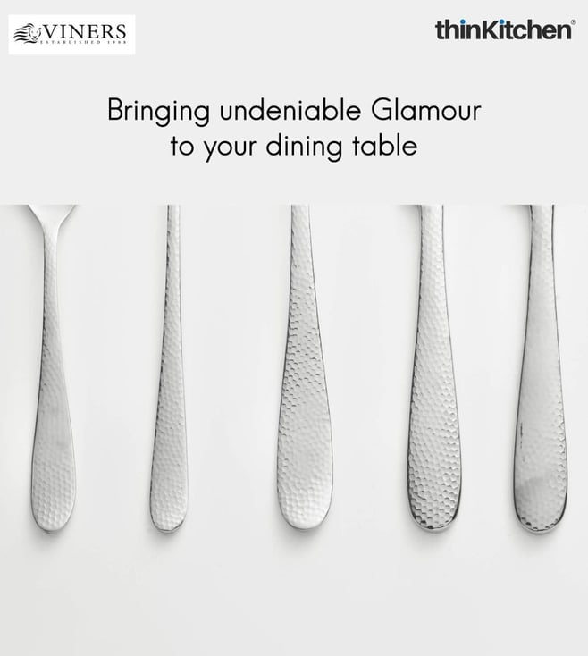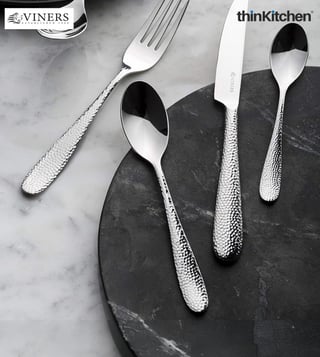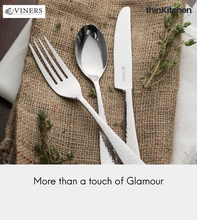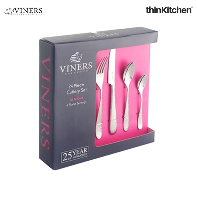 Viners Glamour 24pc Cutlery Set Featuring hammered textured handles with a shimmering effect. Includes 6 knives, forks, teaspoons & dessert spoons. Made from durable 18/0 stainless steel, rust-resistant, dishwasher safe. 25-year guarantee.