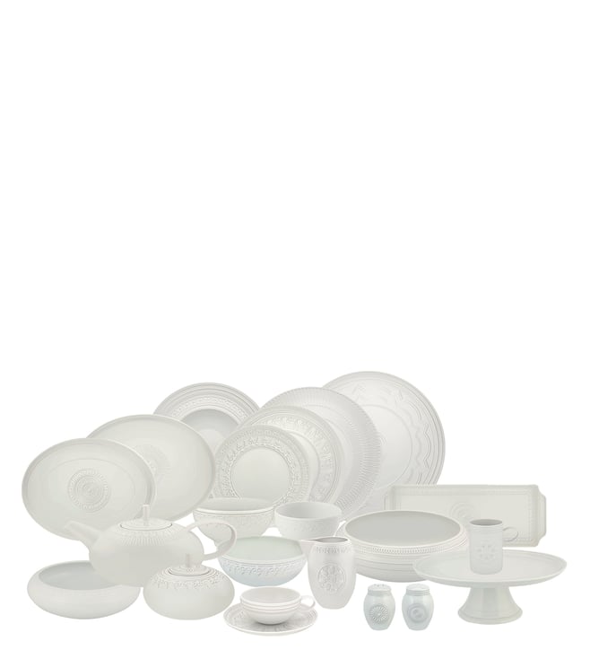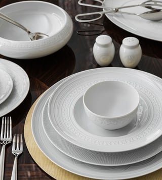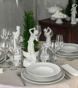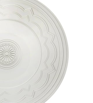 Inspired by the ceilings of the Vista Alegre palace, Ornament surprises with its sophistication and subtlety of the white relief on the white pieces, uniting classical architecture and contemporary design. This Charger Plate with delicate shapes and unique details will grace your table.