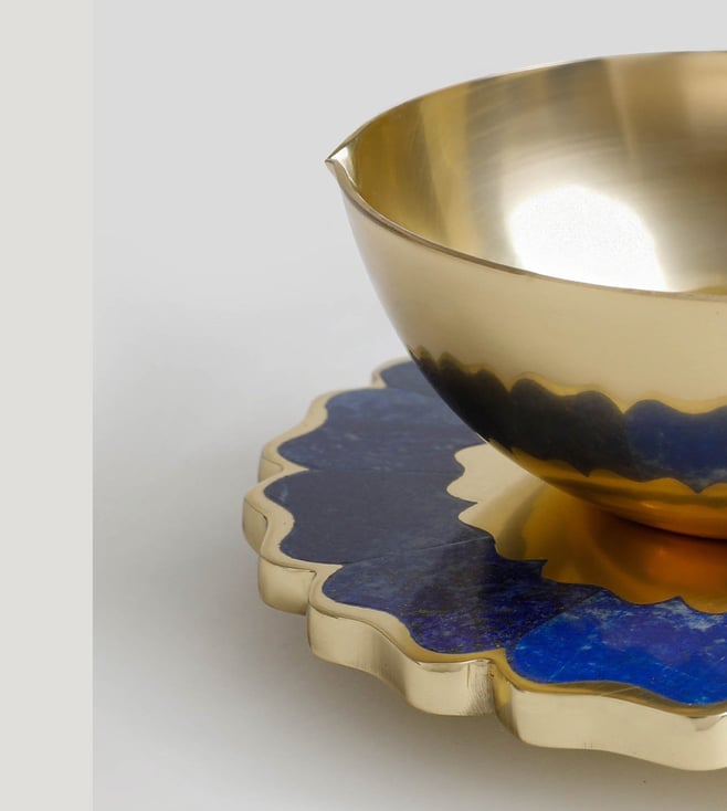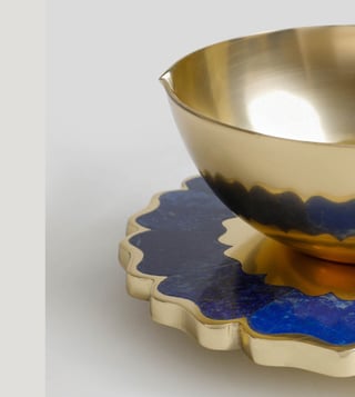 This collection of objects embodies an effortless interplay of form, ritual and function, steeped in the rich heritage of India. Crafted through a masterful blend of ancient metalworking techniques, each piece from thalis and bowls to diyas and candle stands is inlaid with semi-precious stones. Inspired by the vibrant narratives of Pichwai paintings and the bountiful essence of India's flora and fauna, these objects lend this unique take on the sense of celebration in India as a modern heirloom for the home.