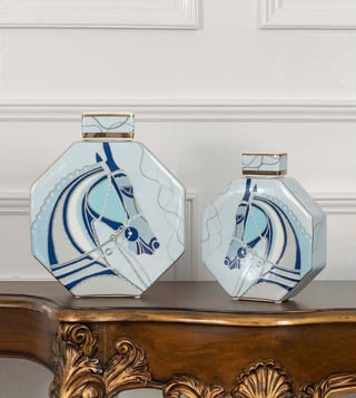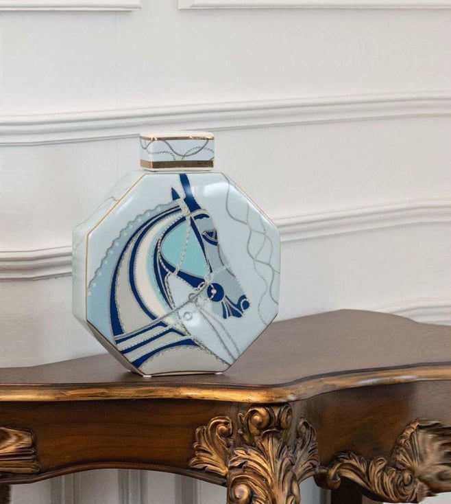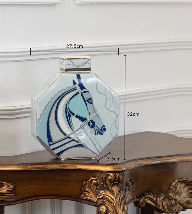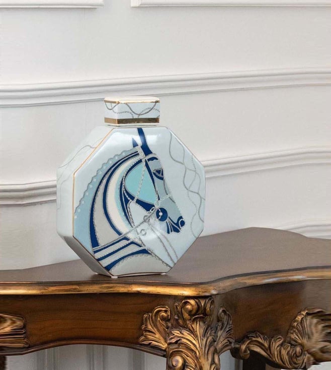 This exclusive jar is the perfect amalgamation of design with crafts. With regal elegance, it comes with a splendid finish that covers the ceramic body beautifully. The octagon silhouette has been finished with metallic detailing on the sides and rims of the lid that adds a quirky element to it. The fantastically hand-painted horse face figure on the front side provides a more realistic and natural appeal to the jar. Disclaimer: All other items in the image are only for display purposes and will not be a part of the delivery content. Country Of Origin - India.