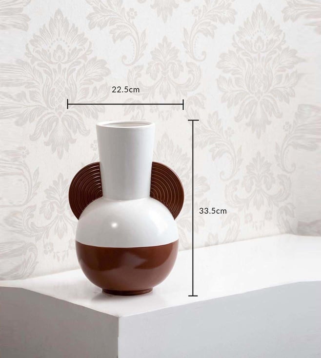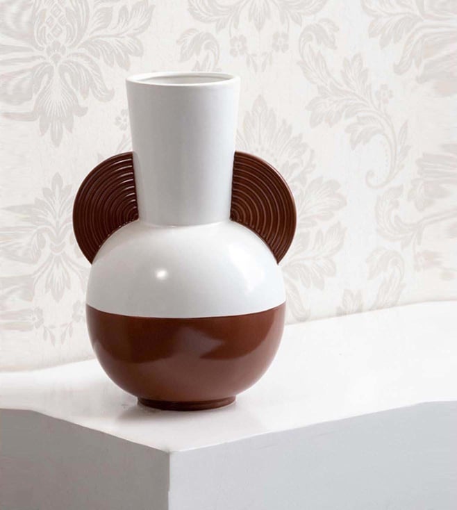 An absolute treat for earthy colour lovers, the Troy ceramic vase has a cute little round silhouette with a long neck in a glossy matte finish. The bottom half boasts a subtle tone and the upper half radiates a serene shade creating a refreshing ambience. It is full of simplicity and minimalism. It is ideal to display your favourite botanicals and succulents on balcony mantles, living room tables or hallway consoles. Disclaimer: Product colour may slightly vary due to photographic lighting sources. Country Of Origin - India.