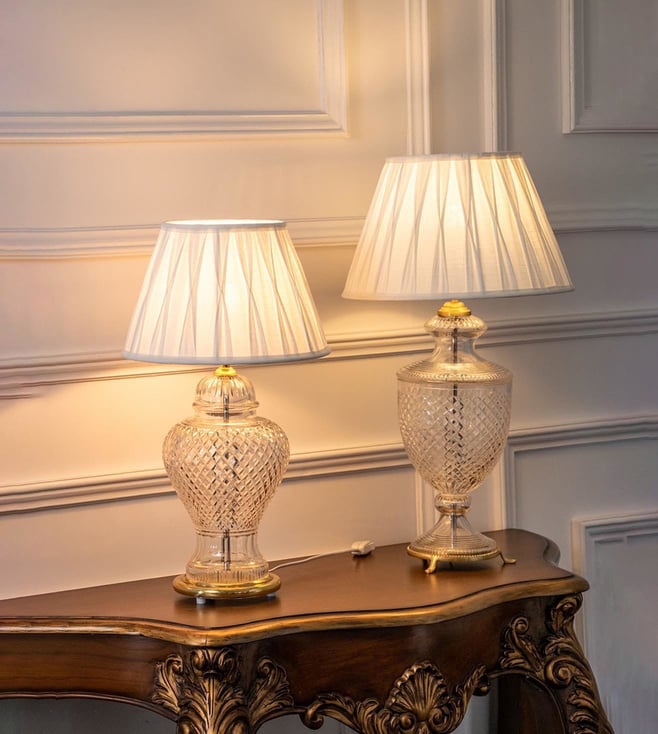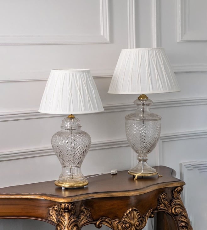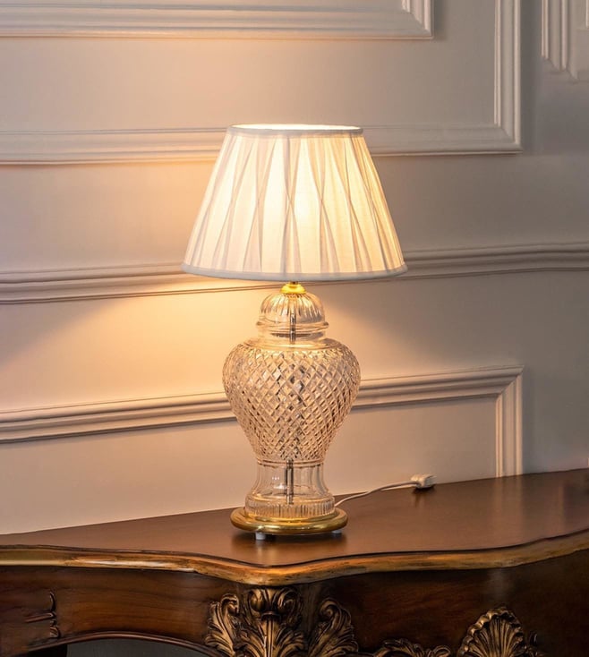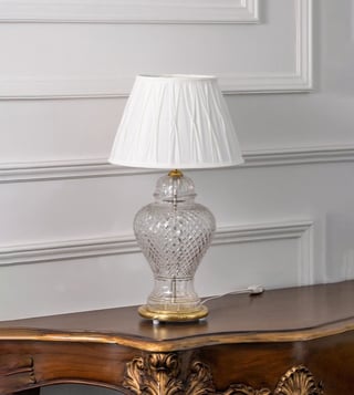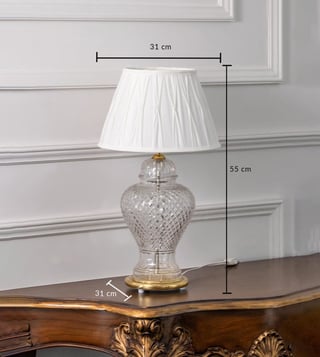 This table lamp made of glass is a decorative lighting fixture designed to be placed on a table or desk. It features a classic and elegant design. Disclaimer: All other items in the image are only for display purposes and will not be a part of the delivery content. Product colour may slightly vary due to photographic lighting sources. Country of Origin - India.