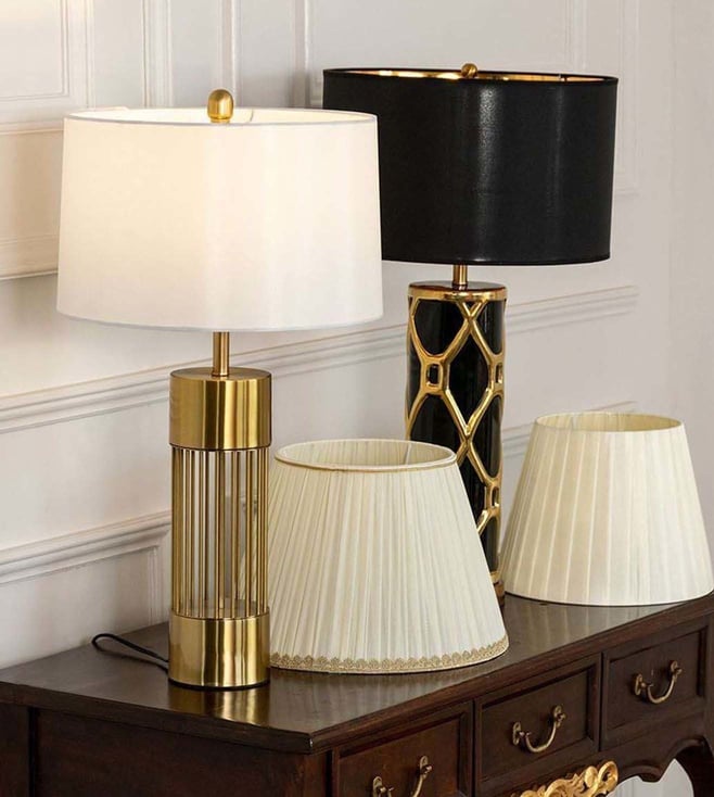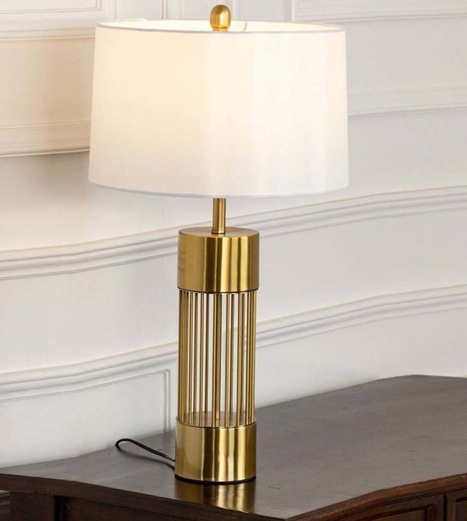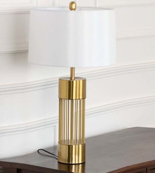This table lamp features a hollow-out design which is an absolute stunner and brings a creative luxurious element to your interior decor. The eye-catcher's body is creatively hollowed out and supported by sleek metal rods. It has a thick base of metal which is stable as well as durable. The subtle drum shade fabric adorns its modern and graceful design. It is suitable for any style of furniture. Disclaimer: All other items in the image are only for display purposes and will not be a part of the delivery content. Country Of Origin - India.