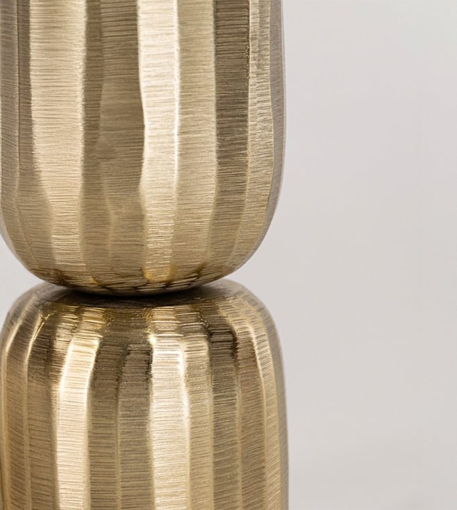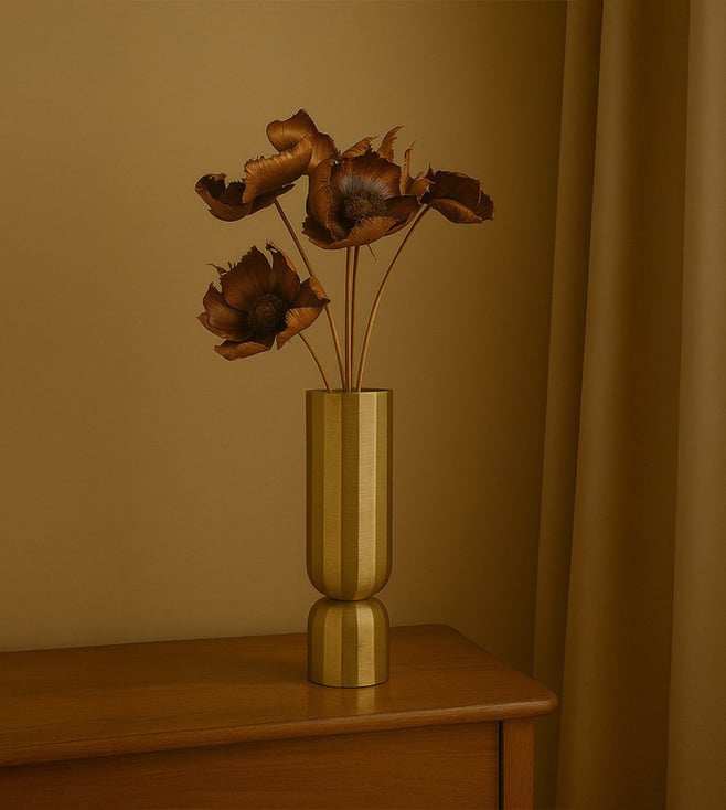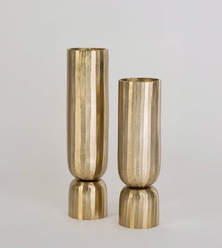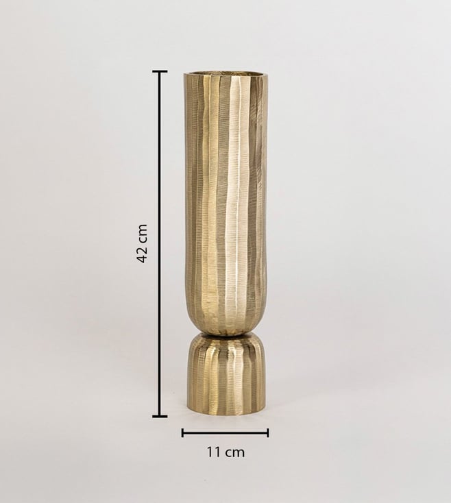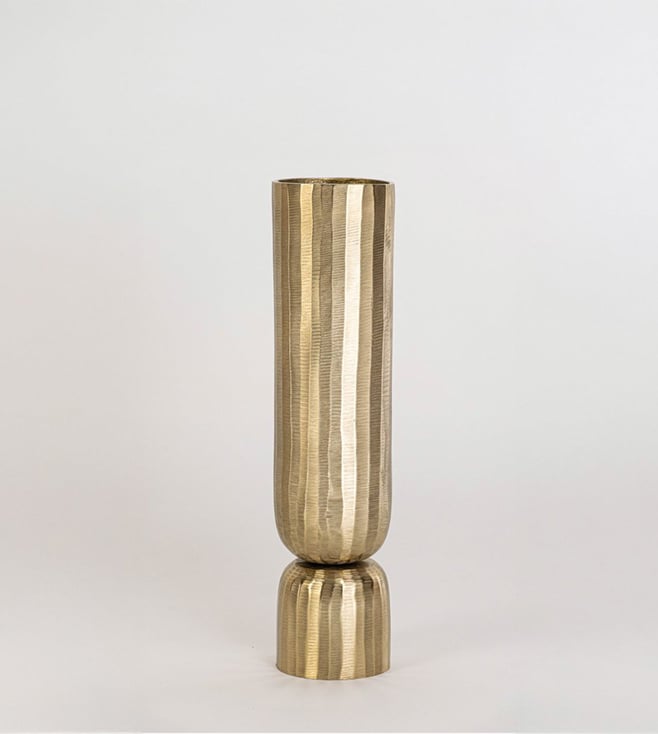 The Sabaah Brass Vase - Large is a sleek and sophisticated statement piece, crafted from aluminium with a radiant gold finish. Its tall, cylindrical form and subtly textured surface make it ideal for showcasing long-stemmed florals or standing alone as a modern metallic accent.