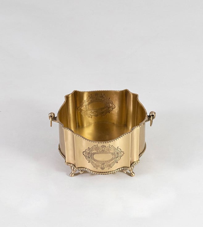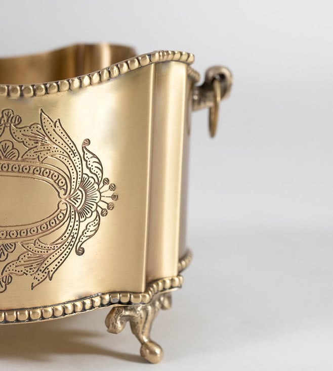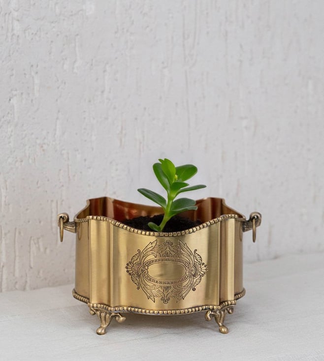 The Vatika Brass Planter is a timeless decorative piece that brings antique charm and botanical elegance to any space. Crafted from premium brass with a rich, burnished gold finish, it features intricate engraving, curved edges, and lion-paw style feet for an elevated, regal look. Whether used for real plants, dried arrangements, or as a standalone accent, this planter makes a striking statement in both classic and eclectic interiors.