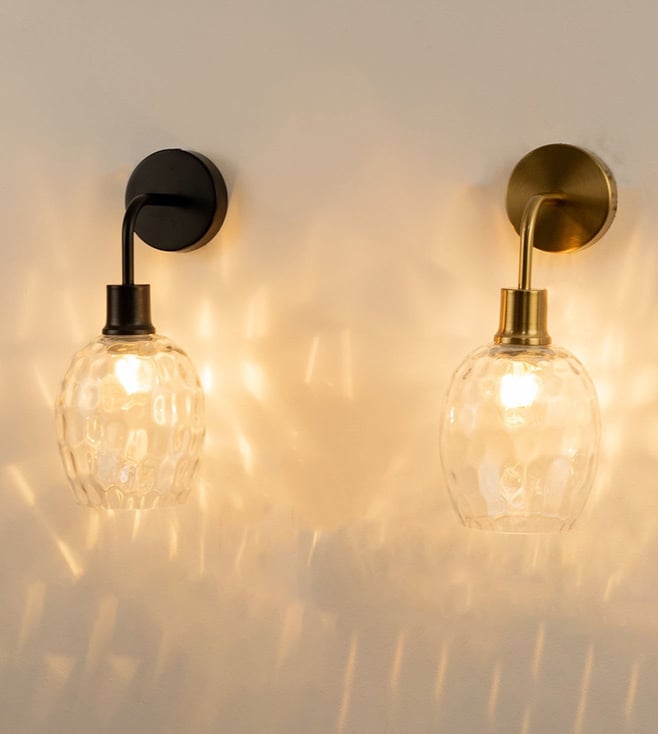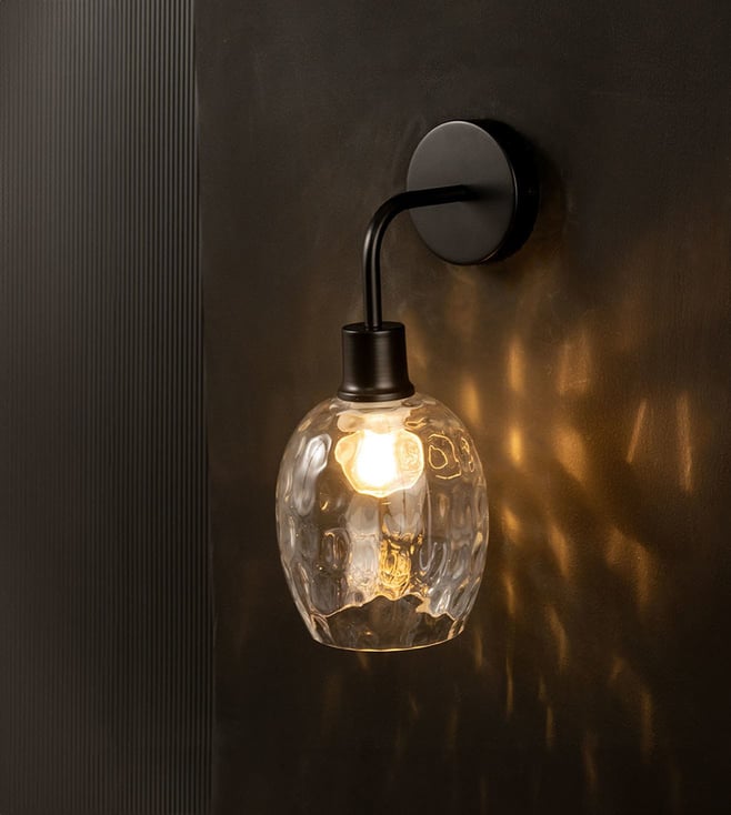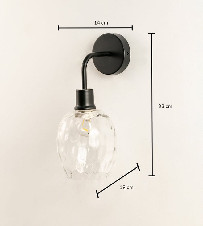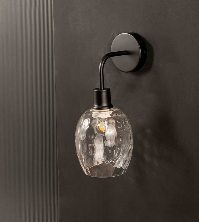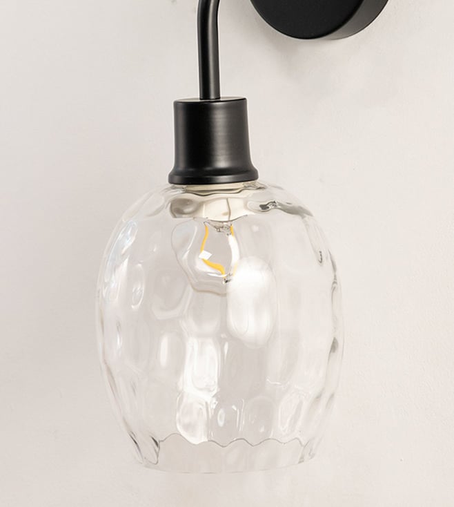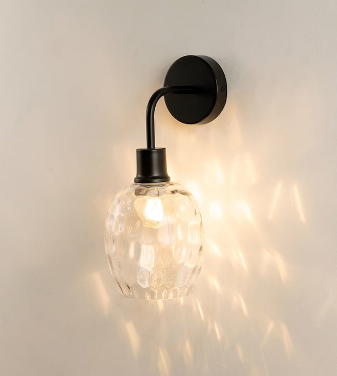 Illuminate your space with the Whispering Homes Black Metal & Glass Wall Light. This stylish fixture combines a sleek black design with elegant glass, perfect for modern interiors. Disclaimer: All other items in the image are only for display purposes and will not be a part of the delivery content. Product colour may slightly vary due to photographic lighting sources. Country of Origin - India.
