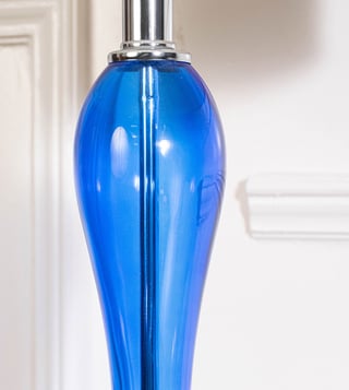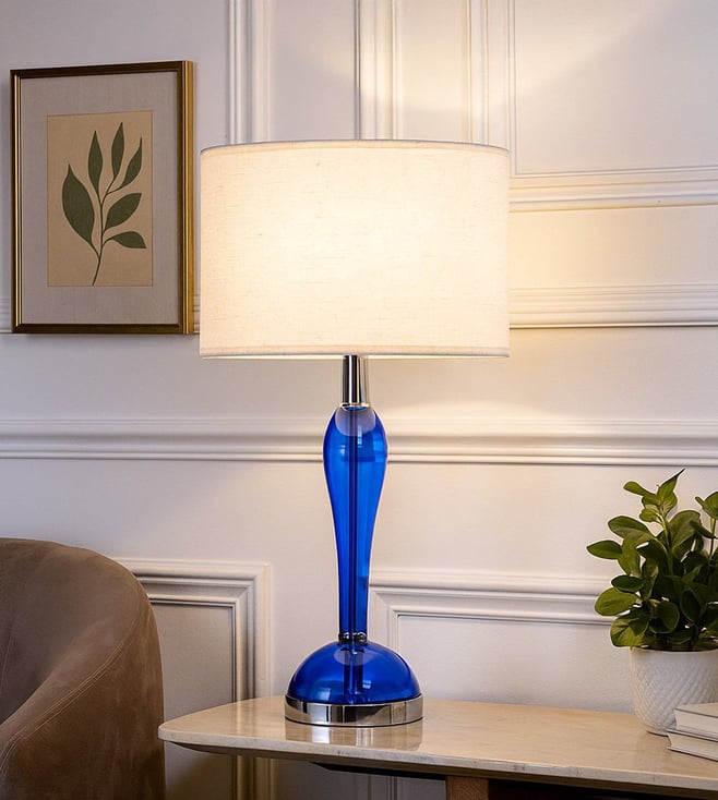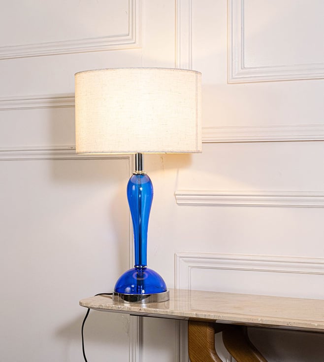 The Saphir Glass Table Lamp is a striking blend of modern elegance and bold design. Featuring a vibrant blue glass body paired with a sleek metal base, it instantly adds a touch of sophistication to any room. The white cotton shade diffuses light softly, creating a warm and inviting ambiance perfect for bedside tables, living rooms, or study corners. Key Features: Vibrant blue glass base for a bold and elegant look Durable metal and glass construction for lasting quality White cotton shade that softens and spreads light evenly Compatible with E27 bulbs for bright and versatile lighting.