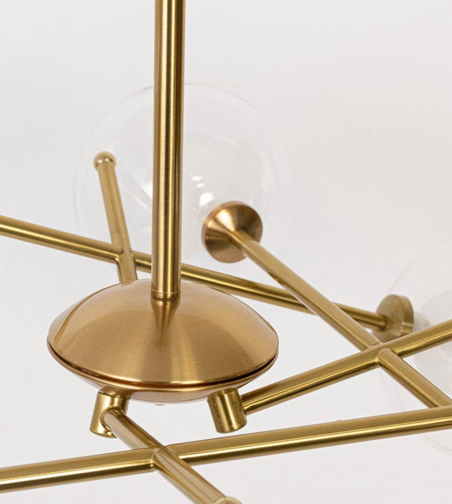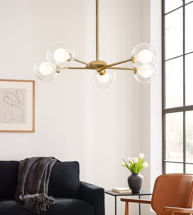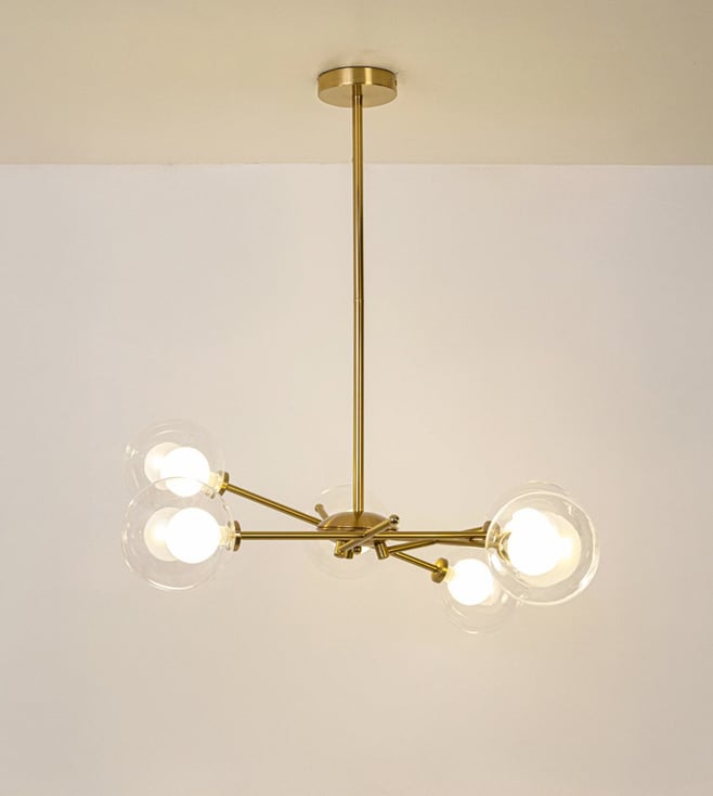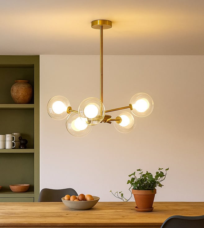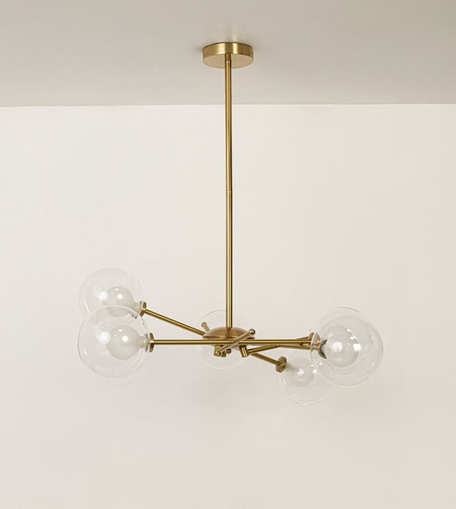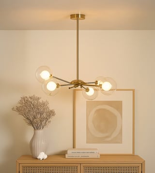 The Saylor Brass Chandelier is a bold blend of modern geometry and mid-century charm. With its striking gold metal arms and spherical glass shades, this chandelier adds a sculptural elegance and radiant warmth to contemporary interiors. Key Features: Gold-finished metal frame with a sleek, minimal design Five clear glass globes for even light distribution Compatible with standard E27 bulb fittings Made from durable metal and premium-grade glass Perfect for living rooms, dining areas, or modern entryways.