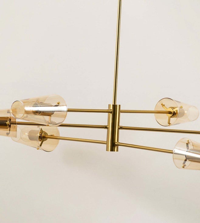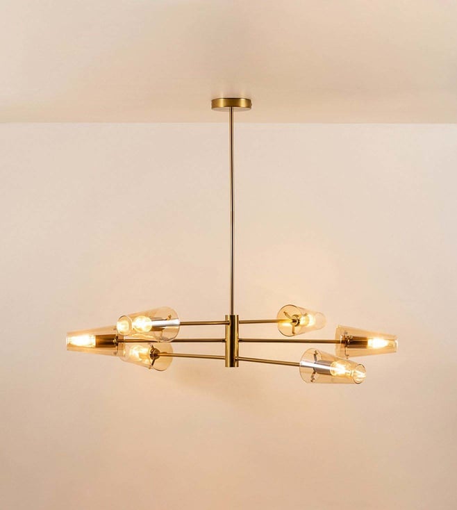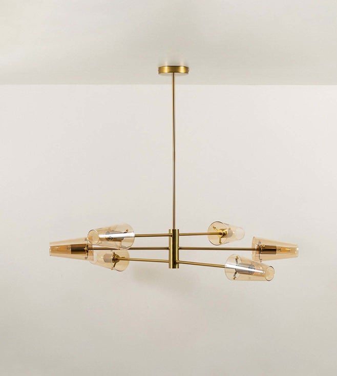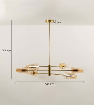 Elevate your space with the Whispering Homes Gold & Amber Metal Chandelier. Its elegant design blends warmth and luxury, making it a stunning focal point for any room. Disclaimer: All other items in the image are only for display purposes and will not be a part of the delivery content. Product colour may slightly vary due to photographic lighting sources. Country of Origin - India.