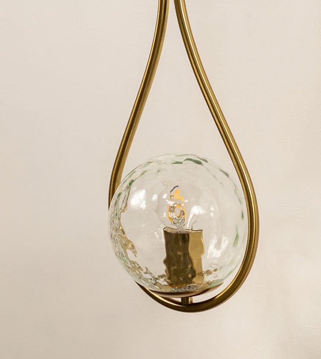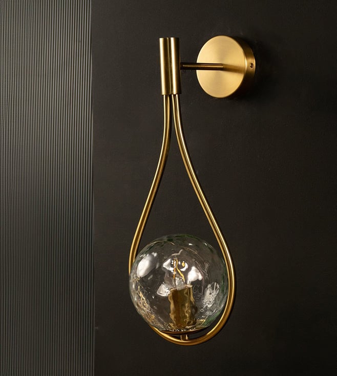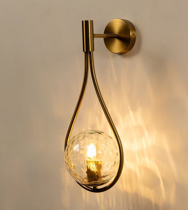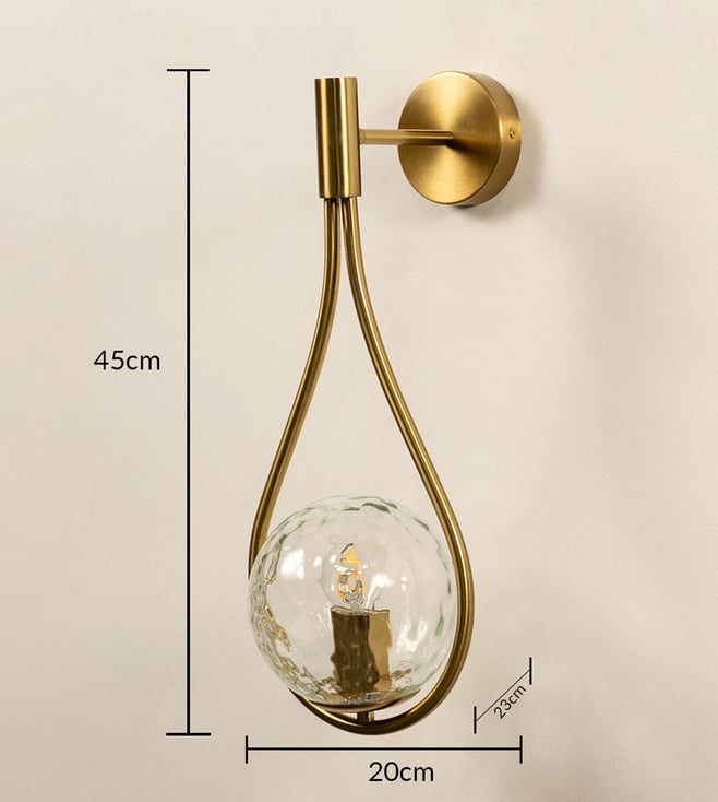 Illuminate your space with the elegant Whispering Homes Gold & Transparent Metal & Glass Wall Light, blending modern design and sophistication. Disclaimer: All other items in the image are only for display purposes and will not be a part of the delivery content. Product colour may slightly vary due to photographic lighting sources. Country of Origin - India.
