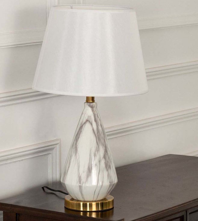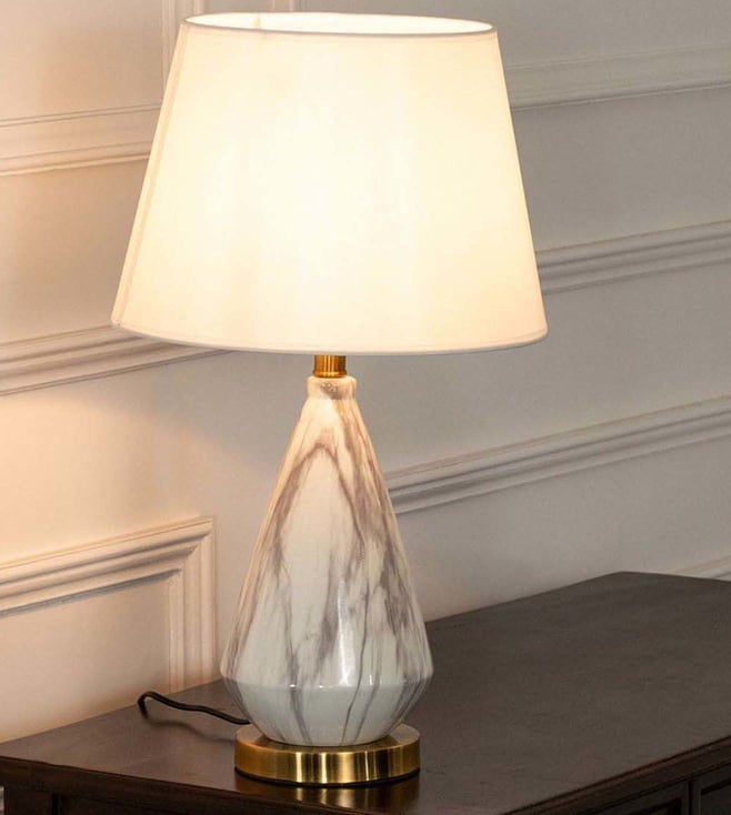 An absolute epitome of a minimalist yet classy look, this ceramic table lamp is an aesthetic pick to adorn your home decor. It will surely dazzle up any living space. It features an elegant geometric pyramid silhouette in mixed shades to create the effect of marble which evokes a modern interpretation of a neoclassical design. With crisp edges and porous texture finished in a clean matte look, it is complemented by subtle drum shade fabric. Disclaimer: All other items in the image are only for display purposes and will not be a part of the delivery content. Country Of Origin - India.