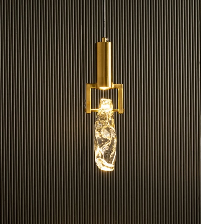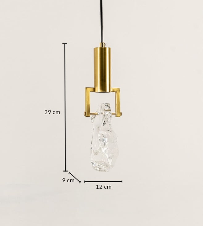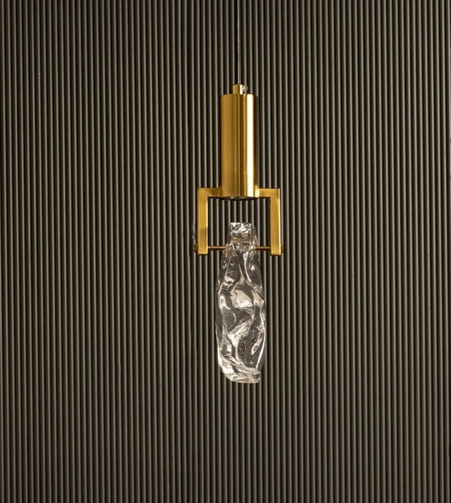 Illuminate your space with the Whispering Homes Gold & Transparent Metal Pendant Light. A stunning blend of elegance and modern design, perfect for any decor. Disclaimer: All other items in the image are only for display purposes and will not be a part of the delivery content. Product colour may slightly vary due to photographic lighting sources. Country of Origin - India.
