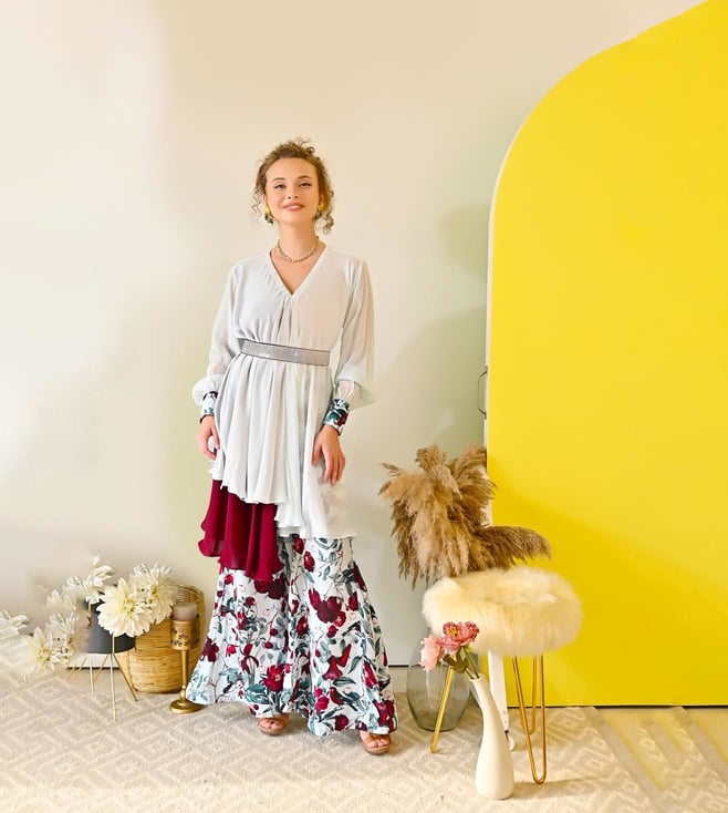 White Silk Regular Fit Embroidered Taffeta Top With Metallic Skirt