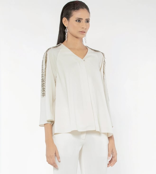 White Silk Regular Fit Embroidered Taffeta Top With Metallic Skirt
