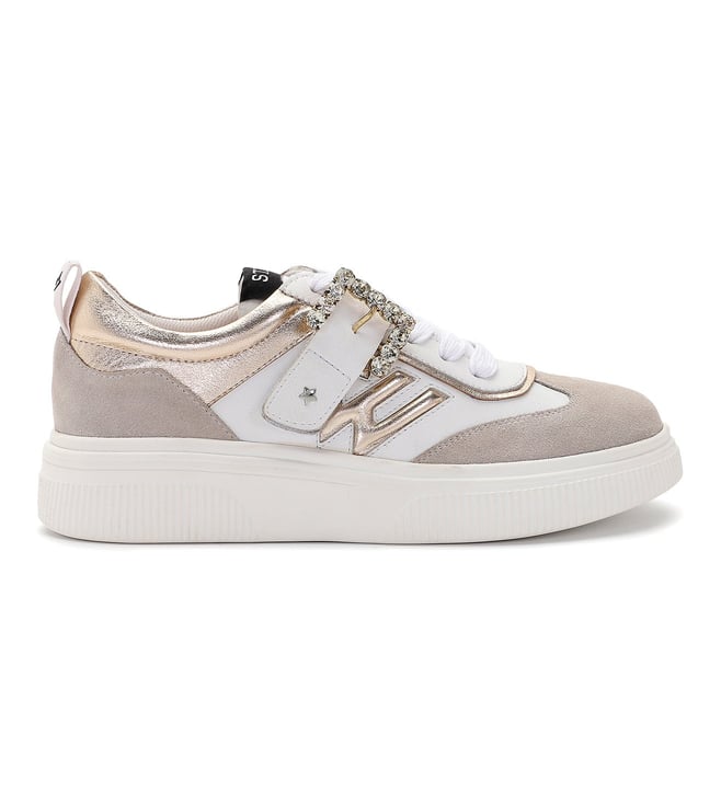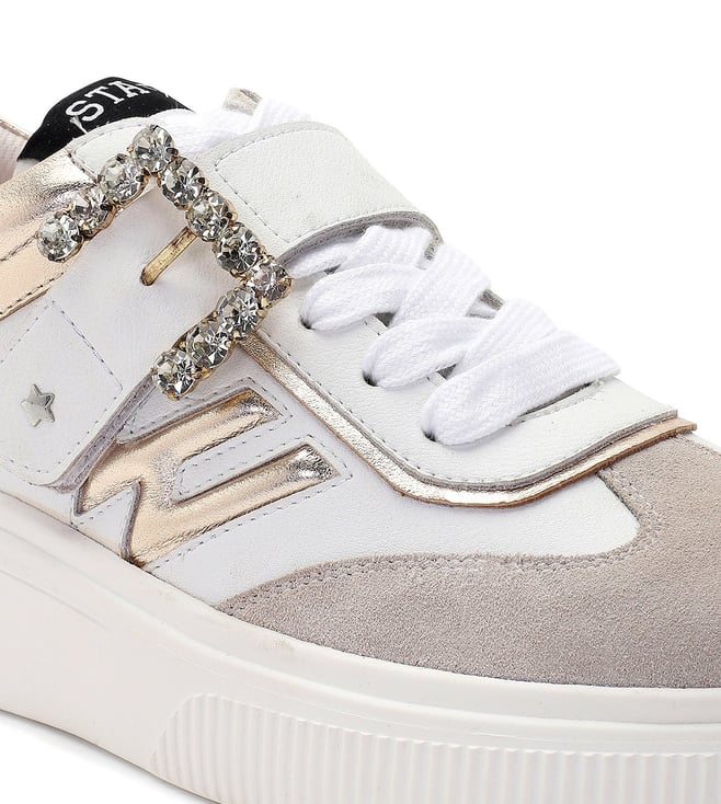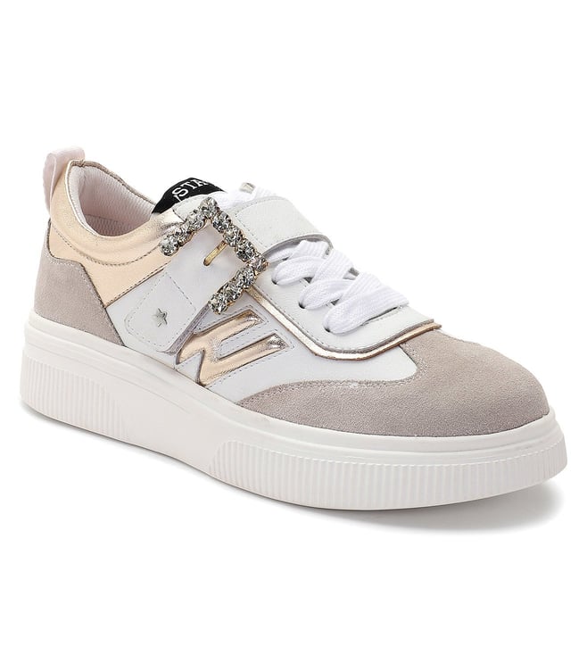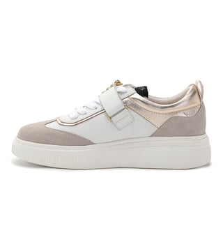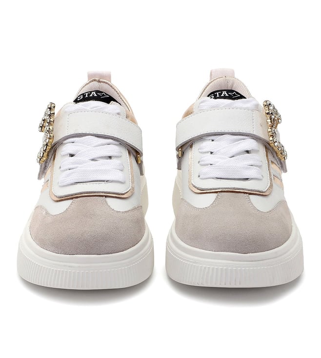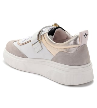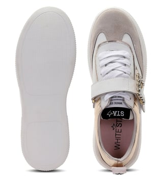 Elevate your style with Whitesta womens ivory sneakers. These sleek and versatile shoes are the perfect addition to any wardrobe, offering a modern twist on a classic design. Crafted with premium materials, they provide all-day comfort and support, making them ideal for any activity. The chic ivory color adds a touch of sophistication to any outfit, whether you are running errands or hitting the town. With a timeless silhouette and durable construction, these sneakers are built to last and keep up with your busy lifestyle. The lace-up closure ensures a secure fit.