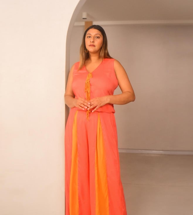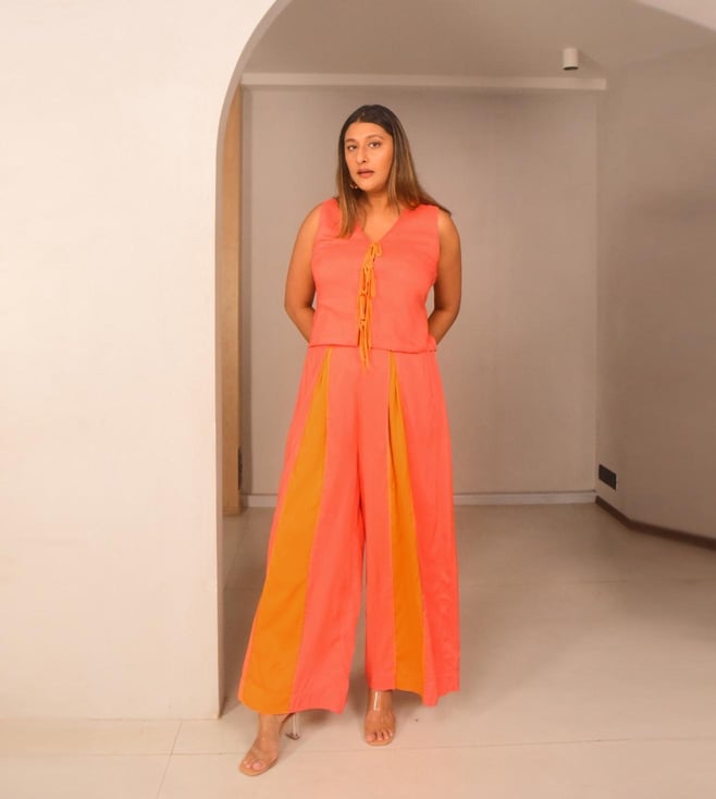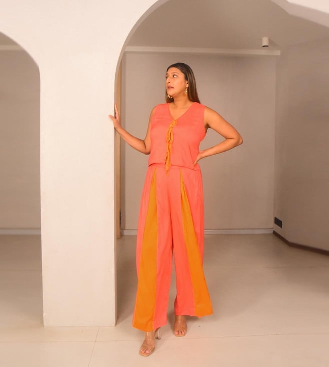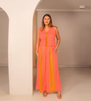 A fun take on everyday ease, this coral modal cotton top is cropped and sleeveless, featuring a tie-up front in contrasting orange. Its soft drape and airy fit make it a go-to for summer gatherings or casual daywear. Pair it with our matching flared pants to complete the set.