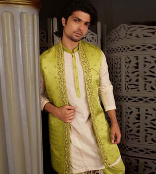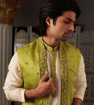 YAJY By Aditya Jain Leaf Green Rameo Malya Nehru Jacket